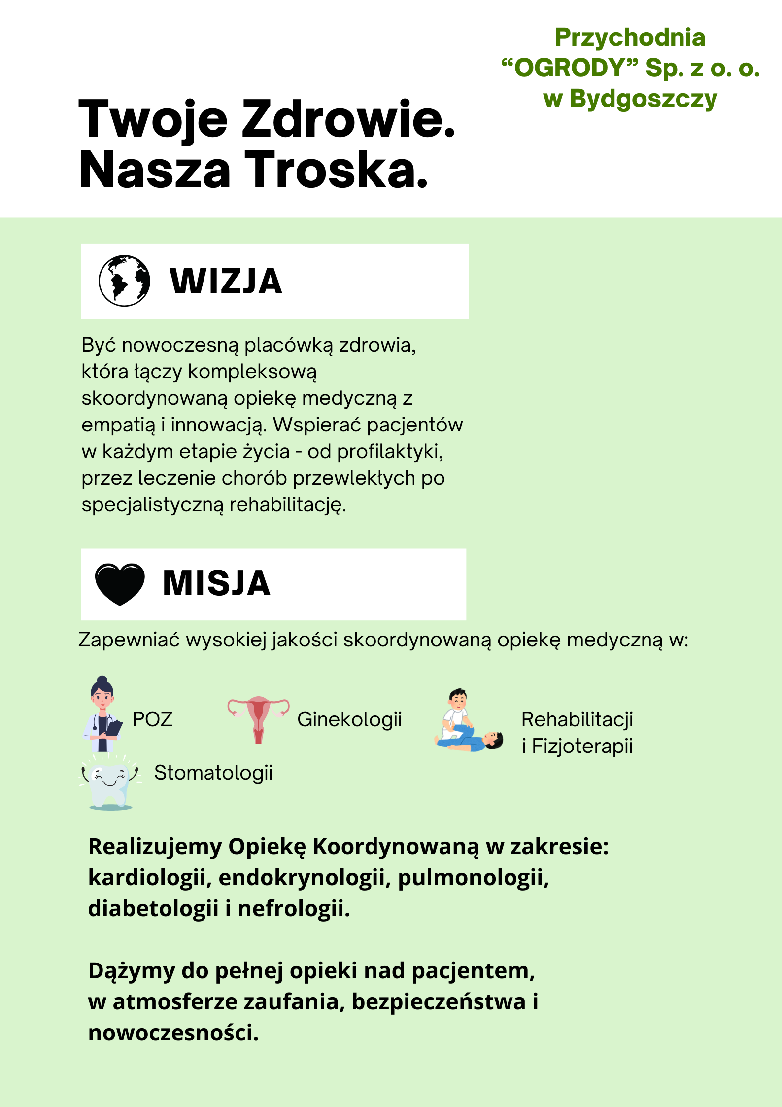 „Naszą misją jest zapewnianie pacjentom dostępu do wysokiej jakości, skoordynowanych usług medycznych w atmosferze zaufania i bezpieczeństwa, obejmujących zarówno podstawową opiekę zdrowotną, ginekologię, stomatologię, rehabilitację i fizjoterapię.